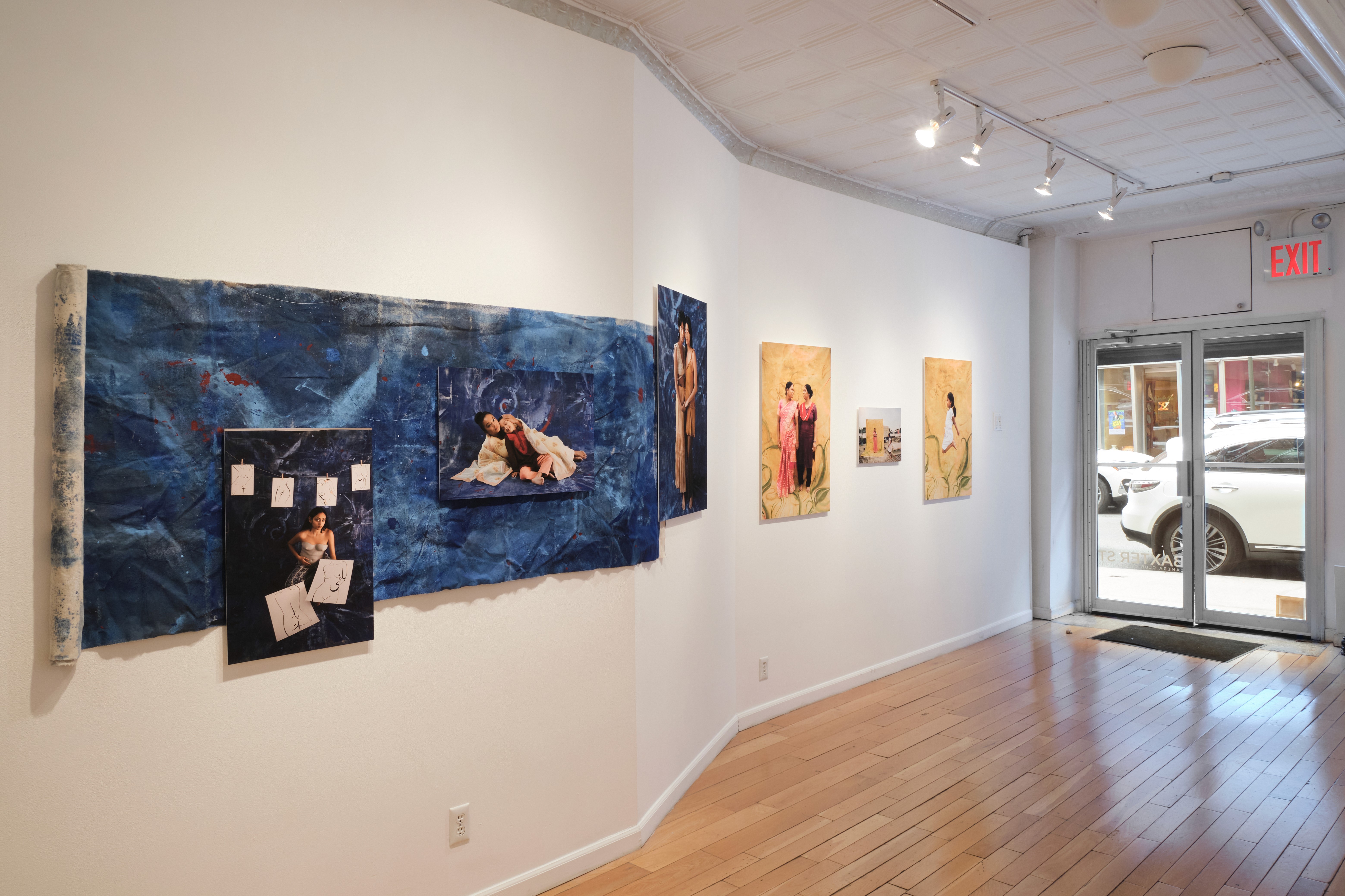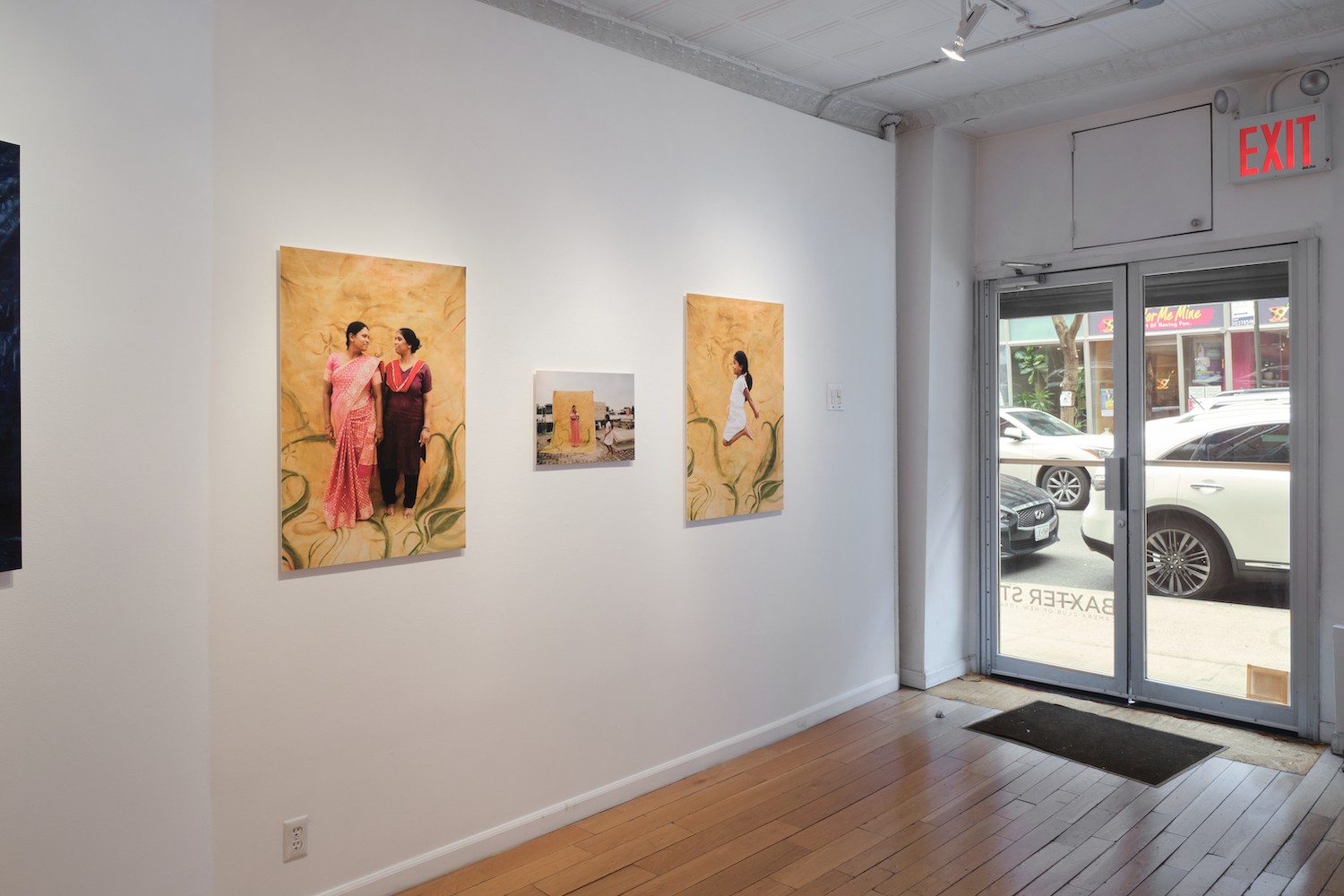 The hand-painted canvas backdrops of interthread act as symbolic safe-spaces and reflections of cultural richness. These diasporic sanctuaries are nomadic— traveling from New Delhi rooftops, to living rooms in West Bengal, to photo studios in New York City— connecting sitters across generations, genders, and national origins. Here, the photographic backdrop, commonly associated with traditional portraiture, evolves into its own lifeform and emerges as a vehicle for cultural reconciliation.